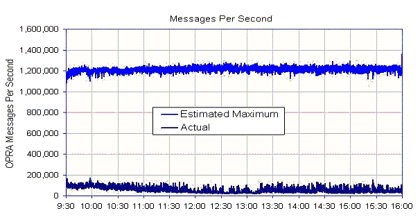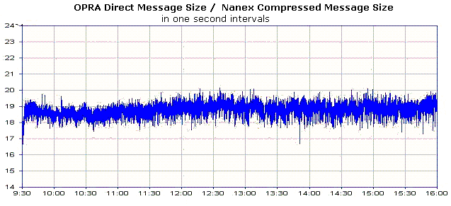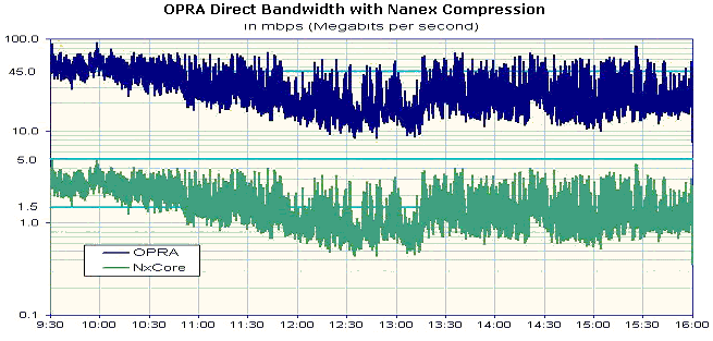 uncompressed OPRA data peaks in the 90mbps range, while the