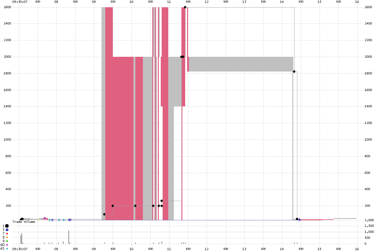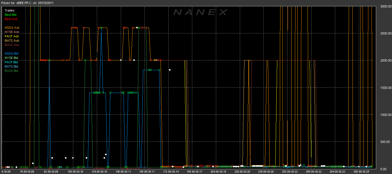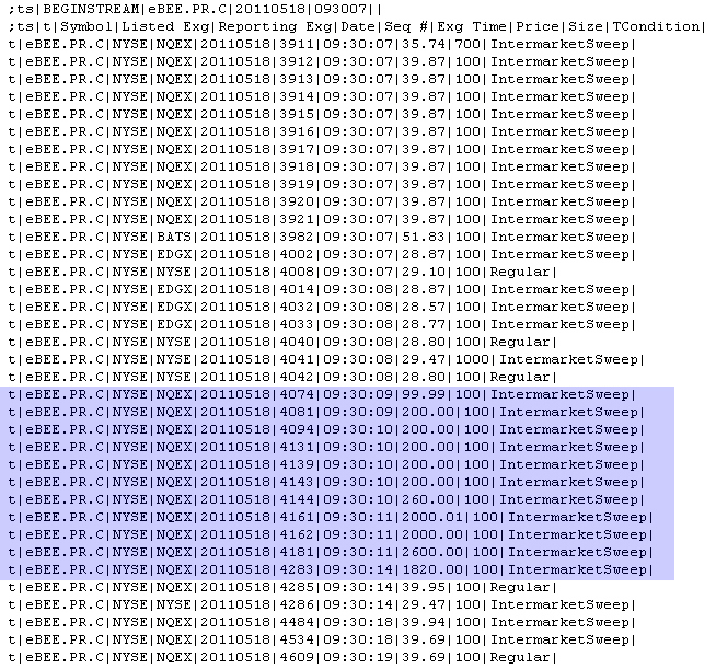 Back to Table Of Contents On 05/18/2011 the stock BEE.PR.C went from $28.8 to $2600.0 in two seconds (Time and Sales prints shown below charts): BEE.PR.C - STRATEGIC HOTEL & RESORTS 8.25 ![]() ![]() The Time and Sales prints: ![]() Approx. 30 minutes later the following notices were issued: 10:04 AM 05/18/2011 Market Operations Update CEE Review Initiated for BEE PRC The NYSE is currently reviewing trades in: STRATEGIC HOTELS & RESORTS, INC. 8.25 % SERIES C CUMULATIVE REDEEMABLE PREFERRED STK (NYSE: BEE PRC) between 09:30:00 a.m. and 09:31:00 a.m. today. The NYSE will provide an update shortly regarding this review. 10:22 AM 05/18/2011 Market Operations Update CEE Review Determination for BEE PRC All NYSE trades in STRATEGIC HOTELS & RESORTS, INC. 8.25 % SERIES C CUMULATIVE REDEEMABLE PREFERRED STK (NYSE: BEE PRC) executed at or above $29.74, between 09:30:00 a.m. and 09:31:00 a.m. ET today will be busted. This decision is not appealable. And the trade cancellations that followed: ;tc|BEGINSTREAM|20110518| ;tc|NxTime|Symbol|Listed Exg|CorrectionType|OrgSeq|OrgCond|OrgPrice|OrgSize| 09:45:00|eBEE.PR.C|NYSE|Cancel;Busted;|4626|0|50.00|200| 09:45:00|eBEE.PR.C|NYSE|Cancel;Busted;|4612|0|39.94|400| 10:20:10|eBEE.PR.C|NYSE|Cancel;Busted;|4635|0|51.93|200| 10:20:10|eBEE.PR.C|NYSE|Cancel;Busted;|4634|0|51.93|200| 10:20:10|eBEE.PR.C|NYSE|Cancel;Busted;|4804|0|51.88|200| 10:20:10|eBEE.PR.C|NYSE|Cancel;Busted;|5711|0|29.93|100| 10:21:37|eBEE.PR.C|NYSE|Cancel;Busted;|3851|95|29.75|100| 10:21:37|eBEE.PR.C|NYSE|Cancel;Busted;|3982|95|51.83|100| 10:21:37|eBEE.PR.C|NYSE|Cancel;Busted;|4806|95|51.88|200| 10:21:37|eBEE.PR.C|NYSE|Cancel;Busted;|4630|0|51.93|200| 10:21:37|eBEE.PR.C|NYSE|Cancel;Busted;|4633|0|51.93|200| 10:22:17|eBEE.PR.C|NYSE|Cancel;Busted;|3855|95|30.67|300| 10:22:17|eBEE.PR.C|NYSE|Cancel;Busted;|3856|66|30.67|300| 10:22:17|eBEE.PR.C|NYSE|Cancel;Busted;|3857|95|30.66|500| 10:22:17|eBEE.PR.C|NYSE|Cancel;Busted;|231108|66|30.66|500| 10:22:17|eBEE.PR.C|NYSE|Cancel;Busted;|3911|95|35.74|700| 10:22:17|eBEE.PR.C|NYSE|Cancel;Busted;|231111|66|35.74|700| 10:22:17|eBEE.PR.C|NYSE|Cancel;Busted;|3912|95|39.87|100| 10:22:17|eBEE.PR.C|NYSE|Cancel;Busted;|231115|66|39.87|100| 10:22:17|eBEE.PR.C|NYSE|Cancel;Busted;|3913|95|39.87|100| 10:22:17|eBEE.PR.C|NYSE|Cancel;Busted;|231118|66|39.87|100| 10:22:17|eBEE.PR.C|NYSE|Cancel;Busted;|3914|95|39.87|100| 10:22:17|eBEE.PR.C|NYSE|Cancel;Busted;|231121|66|39.87|100| 10:22:17|eBEE.PR.C|NYSE|Cancel;Busted;|3915|95|39.87|100| 10:22:17|eBEE.PR.C|NYSE|Cancel;Busted;|231124|66|39.87|100| 10:22:17|eBEE.PR.C|NYSE|Cancel;Busted;|3916|95|39.87|100| 10:22:17|eBEE.PR.C|NYSE|Cancel;Busted;|231128|66|39.87|100| 10:22:17|eBEE.PR.C|NYSE|Cancel;Busted;|3917|95|39.87|100| 10:22:17|eBEE.PR.C|NYSE|Cancel;Busted;|231131|66|39.87|100| 10:22:17|eBEE.PR.C|NYSE|Cancel;Busted;|3918|95|39.87|100| 10:22:17|eBEE.PR.C|NYSE|Cancel;Busted;|231134|66|39.87|100| 10:22:17|eBEE.PR.C|NYSE|Cancel;Busted;|3919|95|39.87|100| 10:22:17|eBEE.PR.C|NYSE|Cancel;Busted;|231138|66|39.87|100| 10:22:17|eBEE.PR.C|NYSE|Cancel;Busted;|3920|95|39.87|100| 10:22:17|eBEE.PR.C|NYSE|Cancel;Busted;|231142|66|39.87|100| 10:22:17|eBEE.PR.C|NYSE|Cancel;Busted;|3921|95|39.87|100| 10:22:17|eBEE.PR.C|NYSE|Cancel;Busted;|231145|66|39.87|100| 10:22:17|eBEE.PR.C|NYSE|Cancel;Busted;|4074|95|9999.00|100| 10:22:17|eBEE.PR.C|NYSE|Cancel;Busted;|231149|66|9999.00|100| 10:22:17|eBEE.PR.C|NYSE|Cancel;Busted;|4081|95|2000.00|100| 10:22:17|eBEE.PR.C|NYSE|Cancel;Busted;|231155|66|2000.00|100| 10:22:17|eBEE.PR.C|NYSE|Cancel;Busted;|4094|95|2000.00|100| 10:22:17|eBEE.PR.C|NYSE|Cancel;Busted;|231158|66|2000.00|100| 10:22:17|eBEE.PR.C|NYSE|Cancel;Busted;|4131|95|2000.00|100| 10:22:17|eBEE.PR.C|NYSE|Cancel;Busted;|231162|66|2000.00|100| 10:22:17|eBEE.PR.C|NYSE|Cancel;Busted;|4139|95|2000.00|100| 10:22:17|eBEE.PR.C|NYSE|Cancel;Busted;|231165|66|2000.00|100| 10:22:17|eBEE.PR.C|NYSE|Cancel;Busted;|4143|95|2000.00|100| 10:22:17|eBEE.PR.C|NYSE|Cancel;Busted;|231169|66|2000.00|100| 10:22:17|eBEE.PR.C|NYSE|Cancel;Busted;|4144|95|2600.00|100| 10:22:17|eBEE.PR.C|NYSE|Cancel;Busted;|231172|66|2600.00|100| 10:22:17|eBEE.PR.C|NYSE|Cancel;Busted;|4161|95|2000.01|100| 10:22:17|eBEE.PR.C|NYSE|Cancel;Busted;|231176|66|2000.01|100| 10:22:17|eBEE.PR.C|NYSE|Cancel;Busted;|4162|95|2000.00|100| 10:22:17|eBEE.PR.C|NYSE|Cancel;Busted;|231179|66|2000.00|100| 10:22:17|eBEE.PR.C|NYSE|Cancel;Busted;|4181|95|2600.00|100| 10:22:17|eBEE.PR.C|NYSE|Cancel;Busted;|231185|66|2600.00|100| 10:22:17|eBEE.PR.C|NYSE|Cancel;Busted;|4283|95|1820.00|100| 10:22:17|eBEE.PR.C|NYSE|Cancel;Busted;|231188|66|1820.00|100| 10:22:17|eBEE.PR.C|NYSE|Cancel;Busted;|4285|0|39.95|100| 10:22:17|eBEE.PR.C|NYSE|Cancel;Busted;|231192|66|39.95|100| 10:22:17|eBEE.PR.C|NYSE|Cancel;Busted;|4484|95|39.94|100| 10:22:17|eBEE.PR.C|NYSE|Cancel;Busted;|231195|66|39.94|100| 10:22:17|eBEE.PR.C|NYSE|Cancel;Busted;|4534|95|39.69|100| 10:22:17|eBEE.PR.C|NYSE|Cancel;Busted;|231199|66|39.69|100| 10:22:17|eBEE.PR.C|NYSE|Cancel;Busted;|4609|0|39.69|100| 10:22:17|eBEE.PR.C|NYSE|Cancel;Busted;|231211|66|39.69|100| 10:22:17|eBEE.PR.C|NYSE|Cancel;Busted;|4610|0|39.94|100| 10:22:17|eBEE.PR.C|NYSE|Cancel;Busted;|231217|66|39.94|100| 10:22:17|eBEE.PR.C|NYSE|Cancel;Busted;|4611|0|39.94|100| 10:22:17|eBEE.PR.C|NYSE|Cancel;Busted;|231221|66|39.94|100| 10:22:17|eBEE.PR.C|NYSE|Cancel;Busted;|4625|0|50.00|500| 10:22:17|eBEE.PR.C|NYSE|Cancel;Busted;|231224|66|50.00|500| 10:22:17|eBEE.PR.C|NYSE|Cancel;Busted;|4629|0|51.93|200| 10:22:17|eBEE.PR.C|NYSE|Cancel;Busted;|231228|66|51.93|200| 10:22:17|eBEE.PR.C|NYSE|Cancel;Busted;|4631|0|51.93|200| 10:22:17|eBEE.PR.C|NYSE|Cancel;Busted;|231231|66|51.93|200| 10:22:17|eBEE.PR.C|NYSE|Cancel;Busted;|4632|0|51.93|100| 10:22:17|eBEE.PR.C|NYSE|Cancel;Busted;|231234|66|51.93|100| 10:22:17|eBEE.PR.C|NYSE|Cancel;Busted;|4736|95|52.18|100| 10:22:17|eBEE.PR.C|NYSE|Cancel;Busted;|231238|66|52.18|100| 10:22:17|eBEE.PR.C|NYSE|Cancel;Busted;|4739|95|52.43|100| 10:22:17|eBEE.PR.C|NYSE|Cancel;Busted;|231244|66|