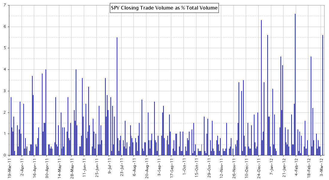 SPY Market on Close Volume as a percentage of Total Volume between March 13,