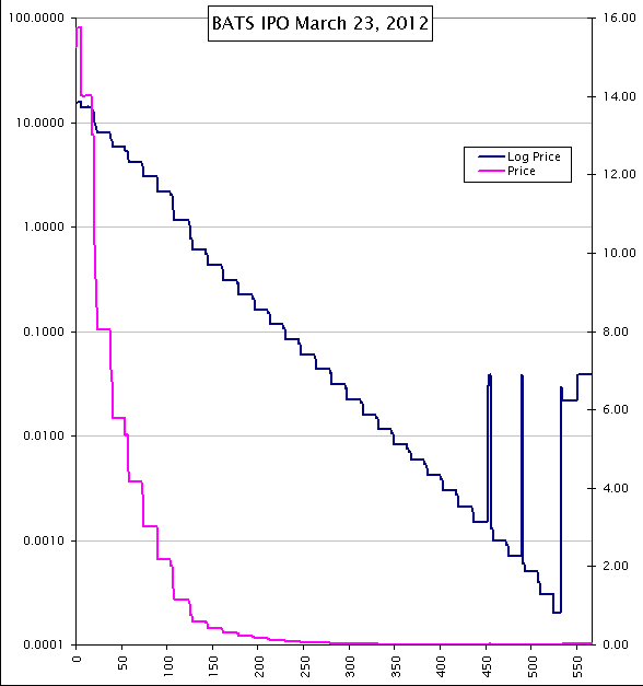 Plotting the 500 or so BATS IPO trades shows that prices declined logarithmically.