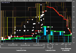 | How to read charts generated by the Nanex QTSequencer During our initial investigation of the Flash Crash of May 6'th, 2010, we came across what appeared to be very unusual bursts of quote traffic. On close examination these bursts appeared to have patterns contained in the data. However, because many of the patterns occurred within one second (or even milliseconds), the question arose of how to visualize them. One of the many tools we developed included the Quote-Trade sequencer, an application that charts every quote and trade sequentially with no data loss or compression. As we continue to use the sequencer on a daily basis to look for strange market phenomena, we have refined the software regularly with new features and more data. Because these charts are not typical, this guide should serve as a reference on how to read them.