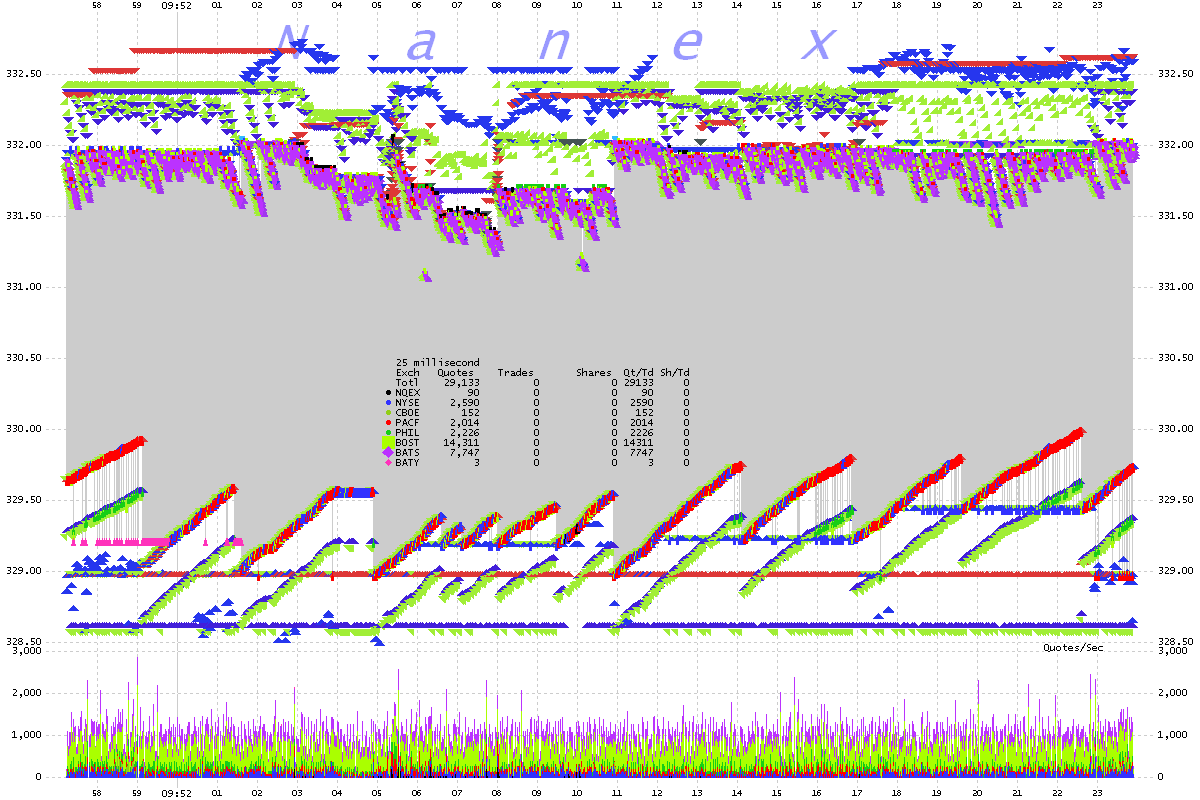 1 second interval chart showing NBBO and trades color coded by exchange (both overlap