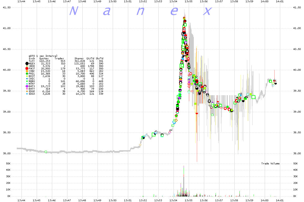 11. DTO 1 second interval chart showing trades color coded by exchange12. DTO 1 second interval chart showing bids and offers color coded by exchange