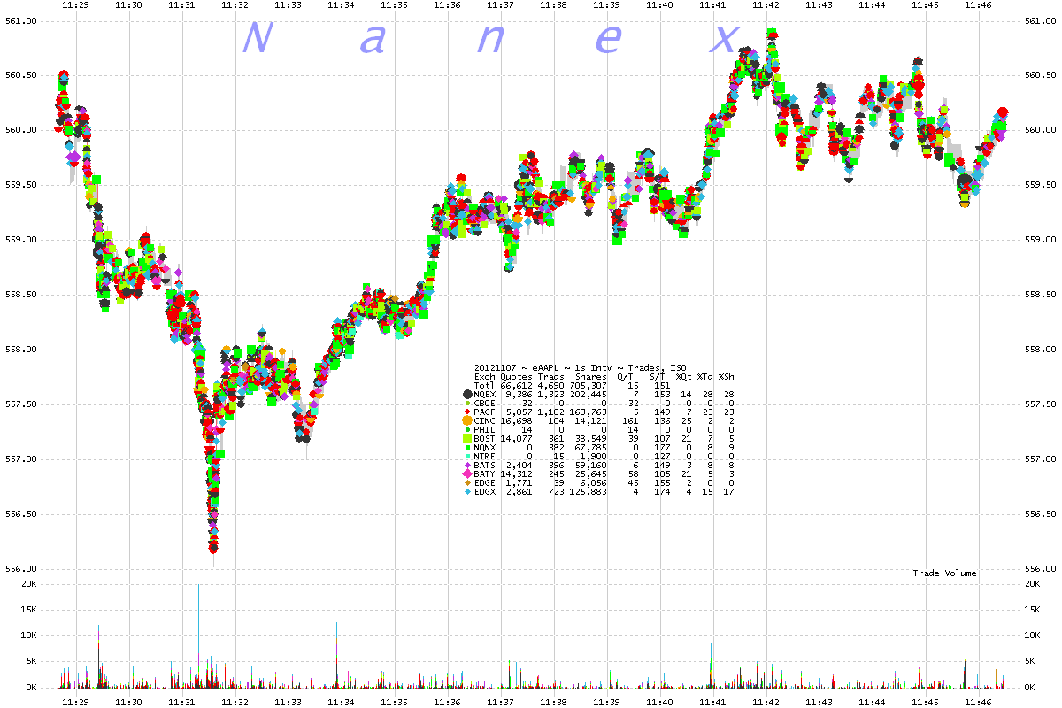 2. AAPL ~ 1 second interval showing non-ISO trades color coded by exchange.