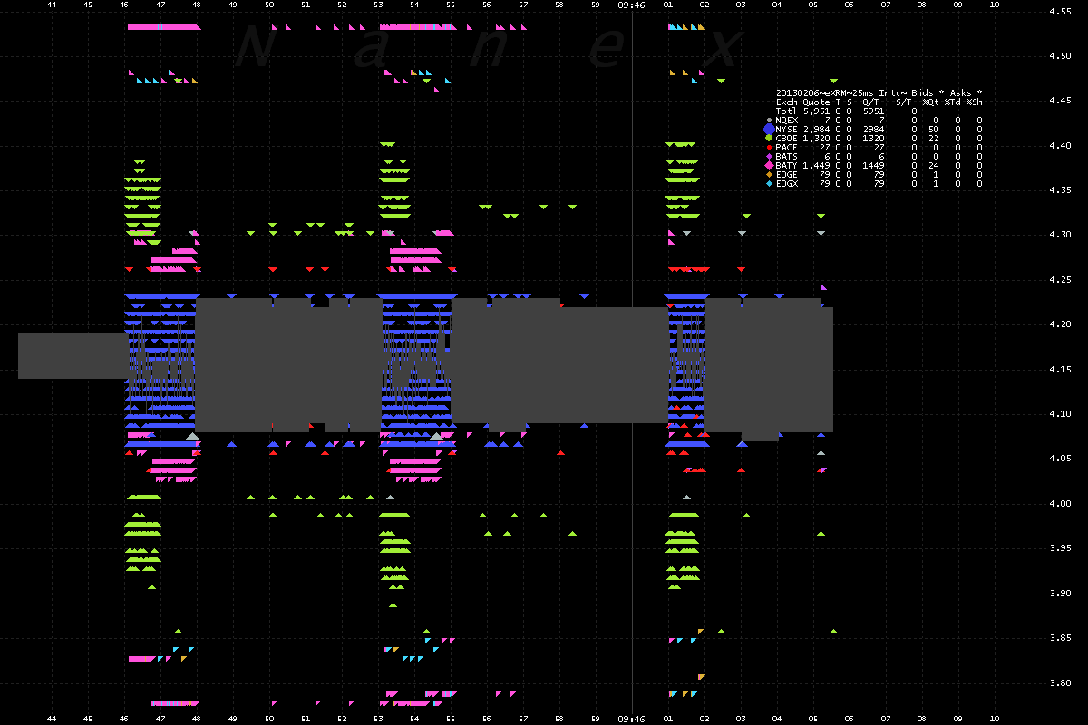 5. XRM showing bids and asks color coded by exchange and NBBO (gray shading). Zoomed out view of chart above.