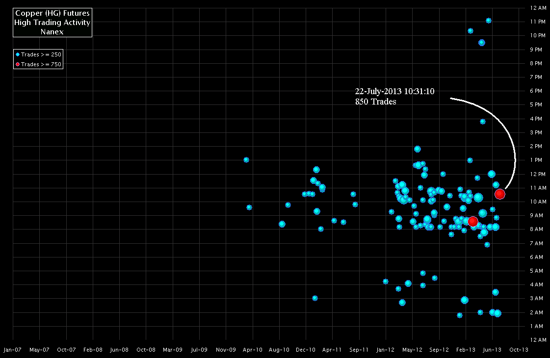 On July 22, 2013 at 10:31:10, Copper Futures activity exploded with the 2nd highest