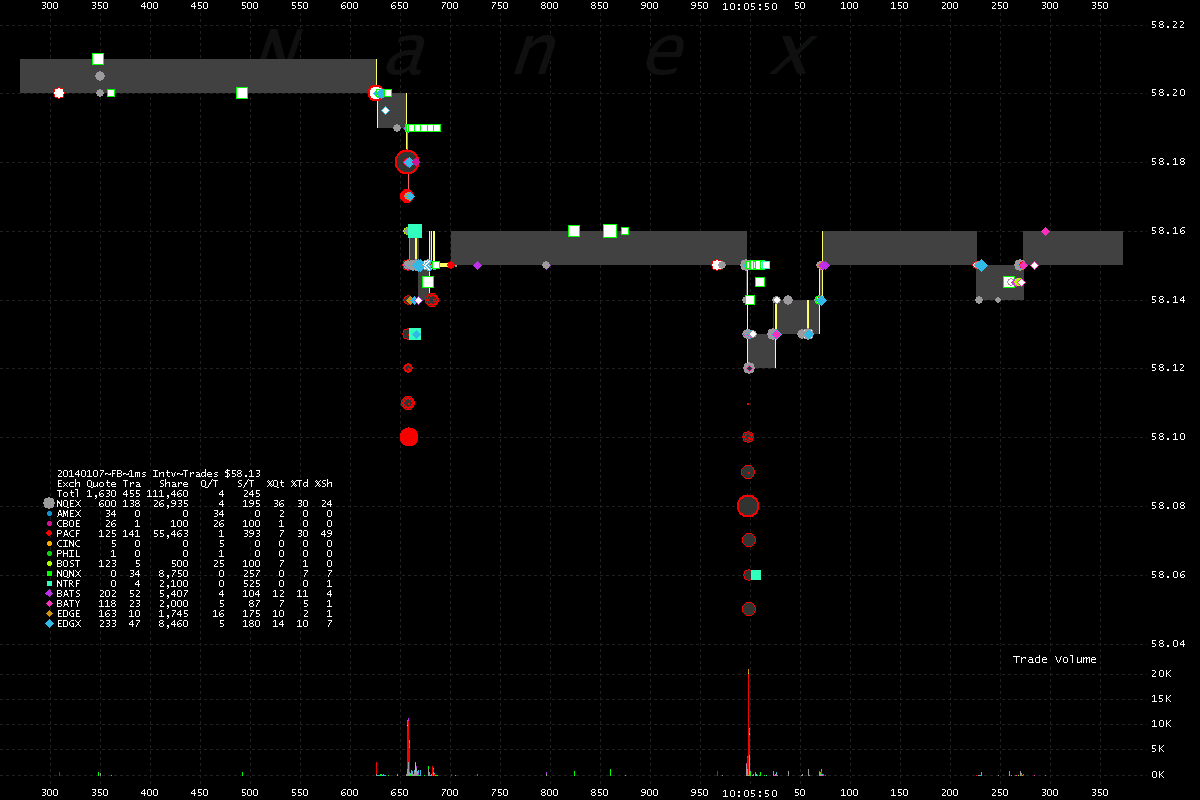 Charts alternate between showing NBBO and Trades. The first 2 show all reporting exchanges, followed by a pair of charts for each reporting exchange. Note that some exchanges (e.g. EDGE and BATY) rarely set the NBBO, but have a significant number of trades. The last 2 charts show trades from TRF's (Trade reporting facilities, which is how Dark Pools report trades). Dark Pools do not post quotes, so there are no corresponding NBBO charts for those. The legend (right) gives useful information on Quote, Trade and Share counts and ratios of these, such as Shares/Trade which gives the average trade size for all exchanges (Totl column) as well as individually for each reporting exchange. |