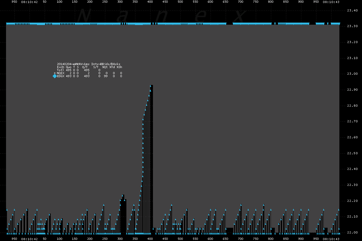 All 2.04 million quotes from EDGX (light blue) - were generated between 8:00 and 9:20. There were