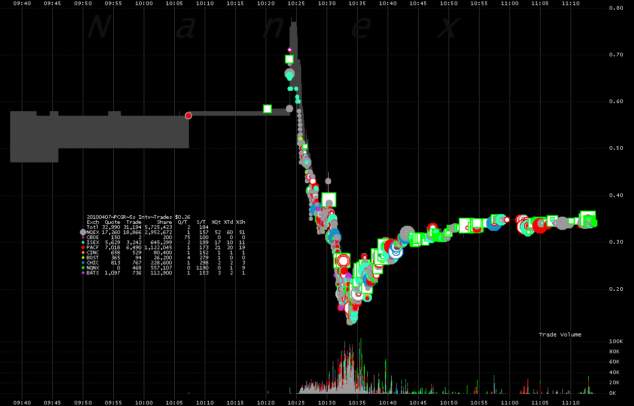 On April 7, 2010, at 10:07:23, the stock opened at $0.57. The sudden activity and drop in price was from
