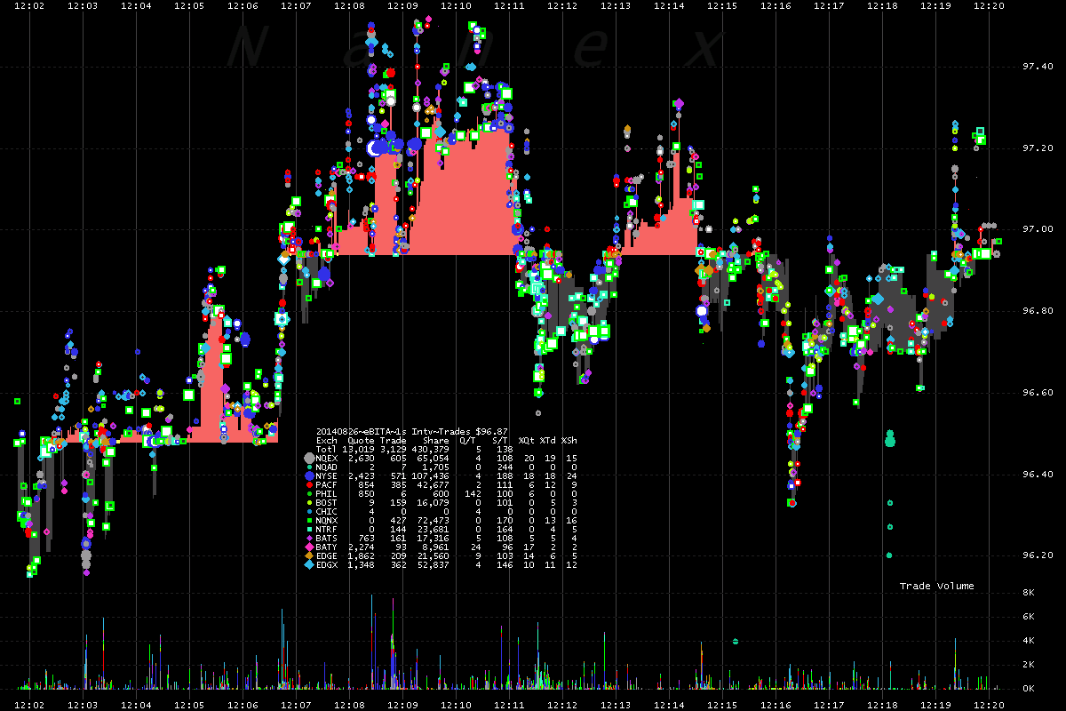 There was a second period of crossed NBBOs, an after-shock, starting at 13:42 and running until just after 14:14.