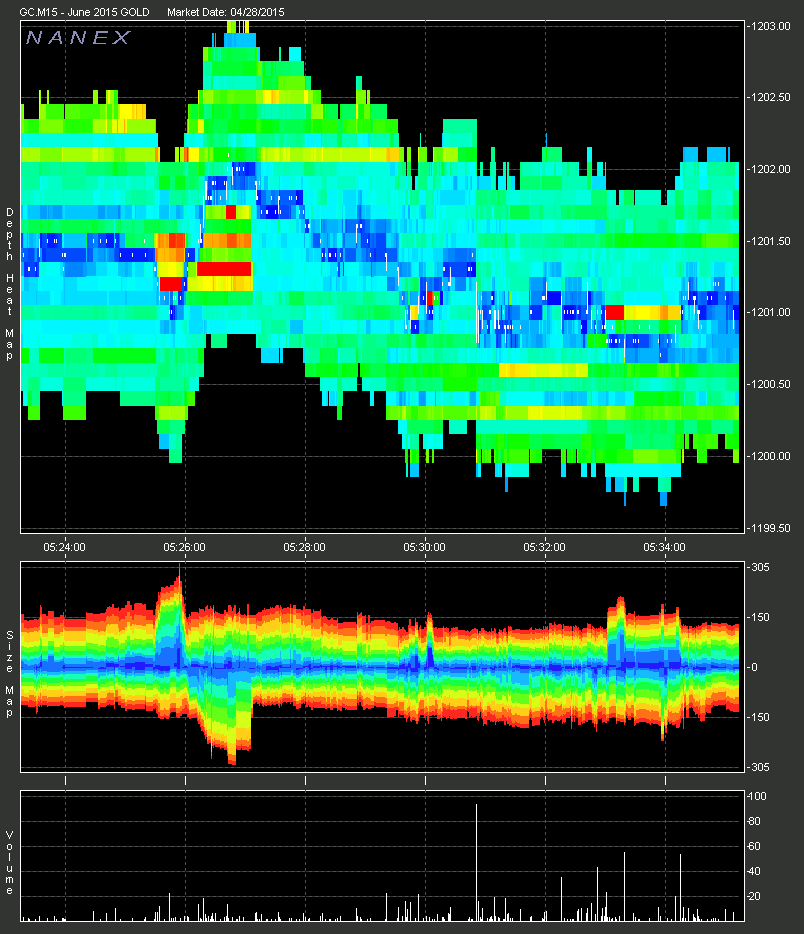 It doesn't take much effort to spot many HFT spoofing algorithms in real-time. Here are 3 examples we easily found in the June 2015 Comex (CME) Gold Futures (symbol: GC) on the morning of April 28, 2015. All times are Eastern Daylight. In each of these cases, no trades (or a tiny few) executed against the large "spoof" order. You can see how prices were influenced by the sudden appearance (and disappearance) of these large, outsized orders.
